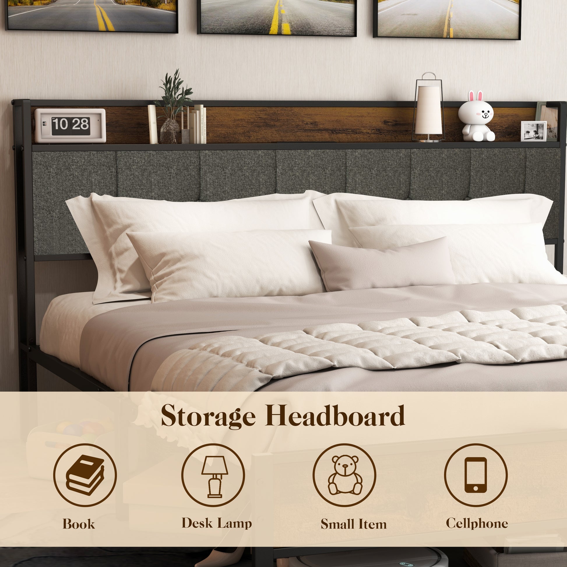【Reliable Socket Saves Charging Space】Headboard is equipped with 2 triangle sockets and 2 USB socketsr, Which can be utilized for connecting a desk lamp and charging a phone without requiring a charging adapter.